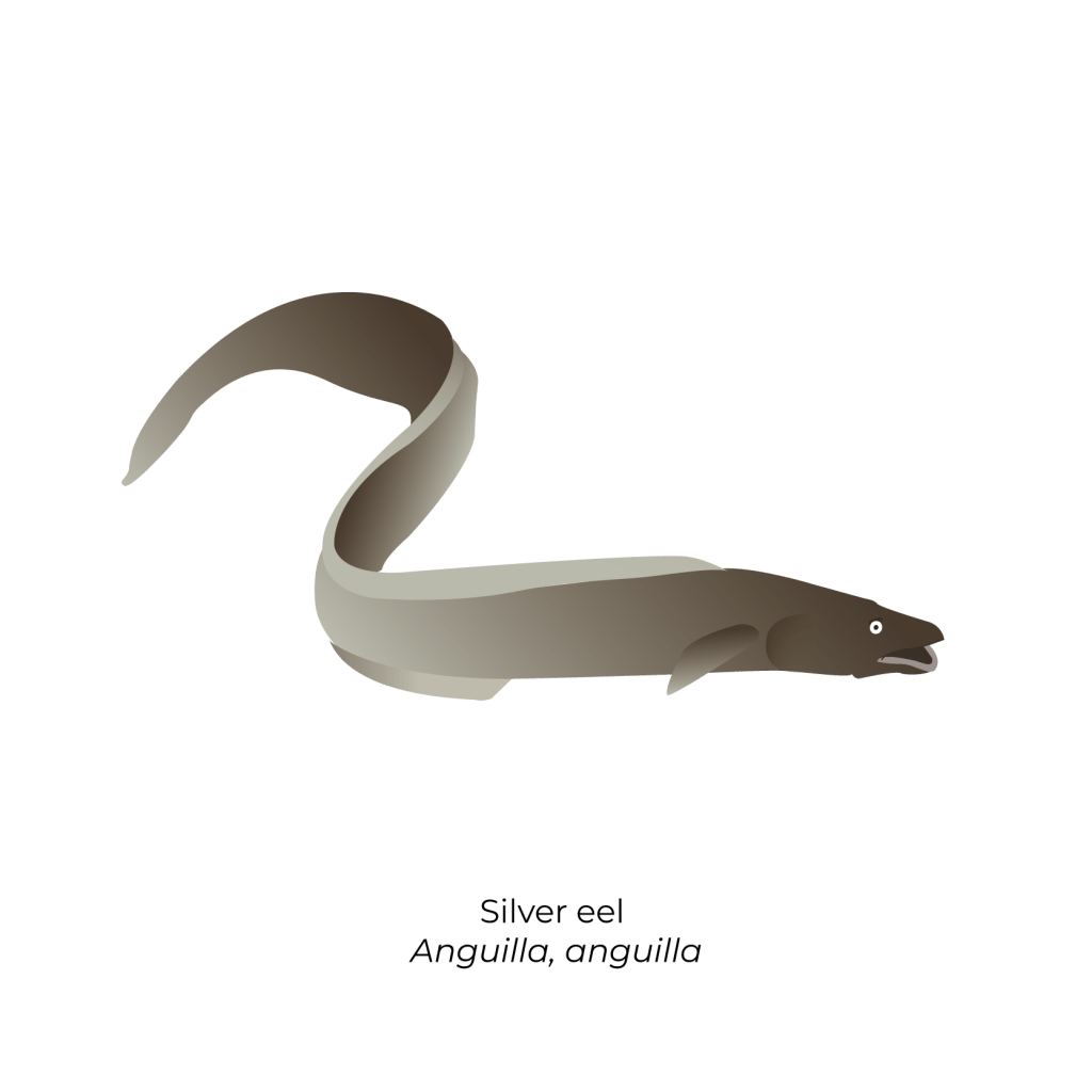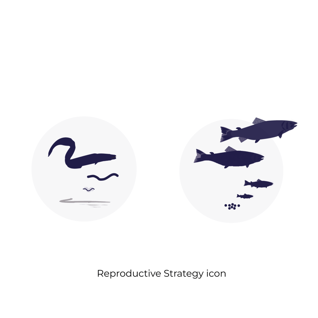Illustration on the migration strategy, occurance, light conditions, reproductive strategy and phototaxis of European silver eels and Atlantic salmon smolts.